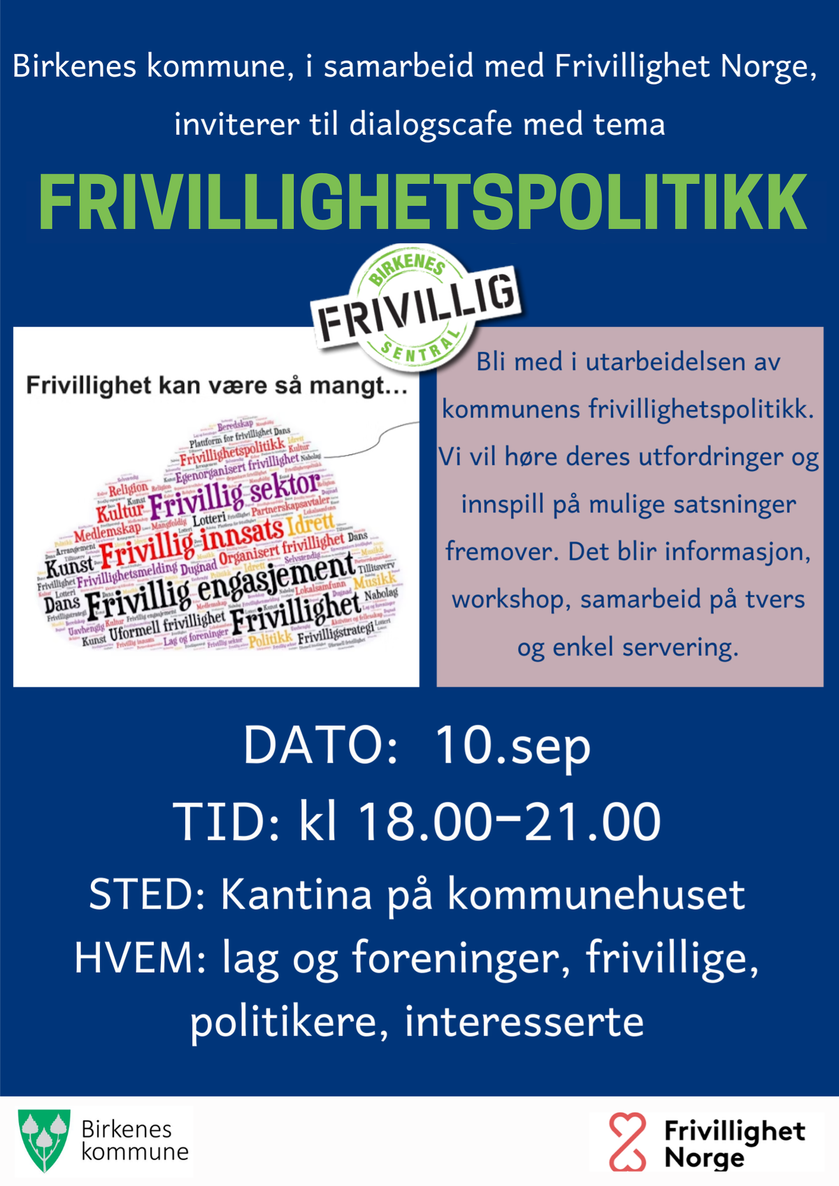 Birkenes Kommune i samarbeid med Frivillighet Norge inviterer til Dialogkafè med tema Frivillighetspolitikk. Påmelding innen 8.september på kalenderen her eller siril.flaa.kirkeholmen@birkenes.kommune.no